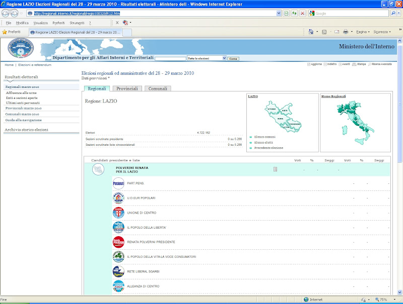 Sintonizzandomi sul sito del ministero degli interni per seguire gli scrutini delle elezioni regionali, vado a vedere la pagina dedicata al Lazio e: OHIBO! C'è qualcosa di strano!